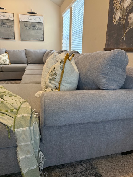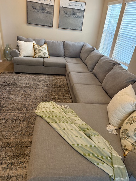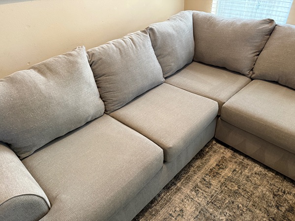 From living spaces- it’s in great condition. Shampooed the entire couch, fully washed all covers. No stains, very clean. Normal wear, small tear on chaise (size of penny)