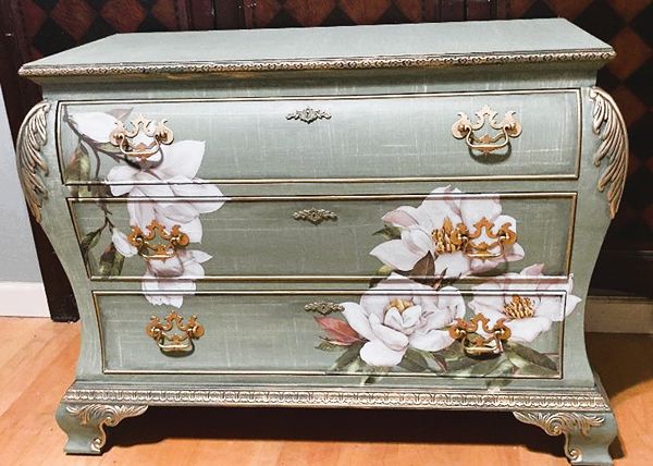 - We cleaned, filled, sanded, primed, texturized with a gorgeous hand applied linen technique in multiple layers, gilded, added Beautiful magnoia blooms for a welcoming, high end design. We then gilded and sealed entire piece with polycrylic for durability.