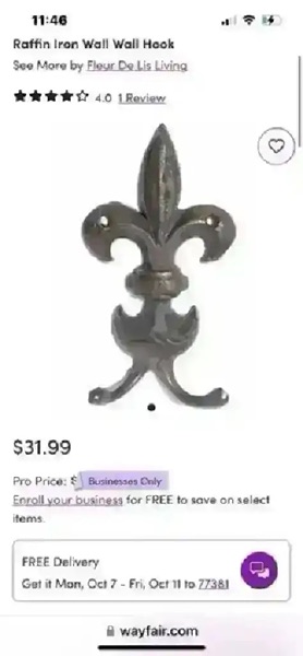 Wrought iron (painted iron) Fleur-de-Lis wall hook that could use more paint or leave it “distressed”.
