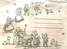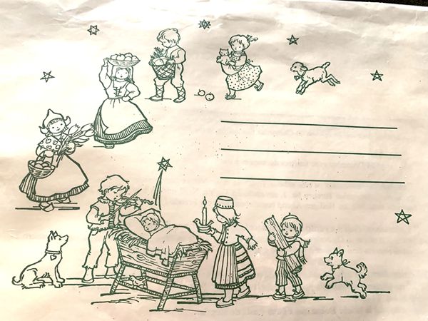 10 ¼” x 14 ¼”; sparkle embellishment; extra front piece with 3 kings, sheep, and townspeople inserts into larger panorama for 3-D/ tabletop stand alone effect. NEW sealed with accompanying envelope with drawings of children bringing gifts to babe in manger.