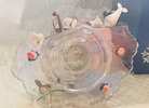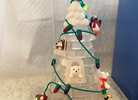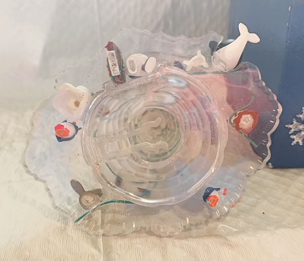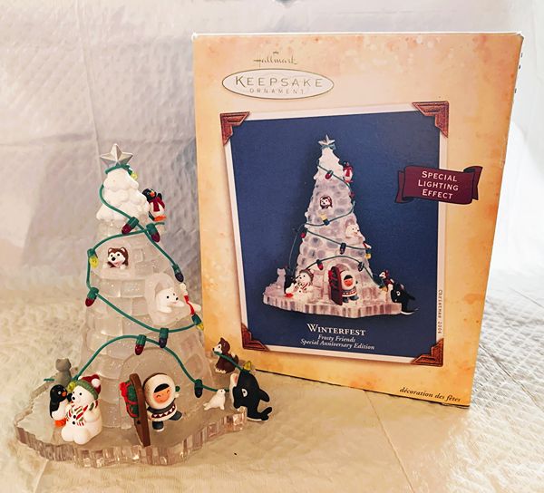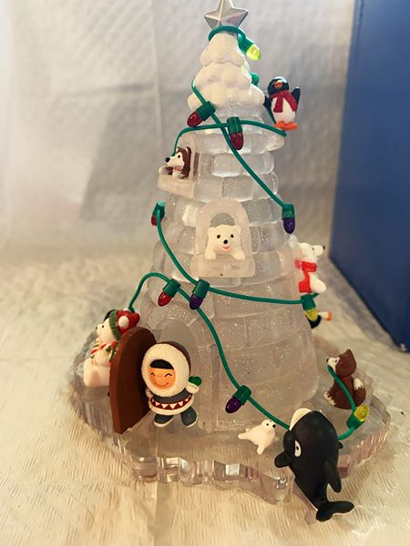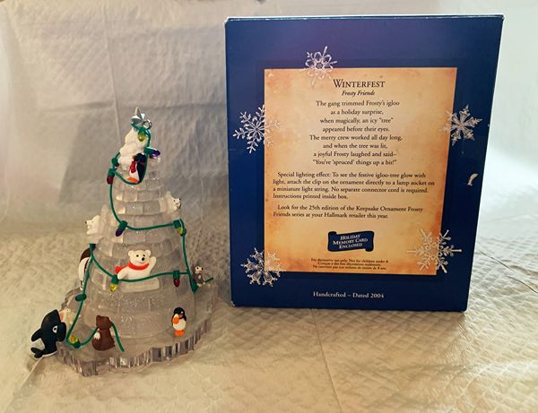 The frosty friends gang gathers from inside and outside a 4¾” igloo-type translucent sparkly tree that can be illuminated from the interior when a clip on the underside of the ornament is connected directly to a lamp socket on a miniature light string. No separate connecting cord is required.  Ornament is in like new condition. Box in very good condition. Price tab and memory card not included. “Brenda’s” is written on the box. Original price $16.95.  Frosty Friends 25th anniversary special edition.