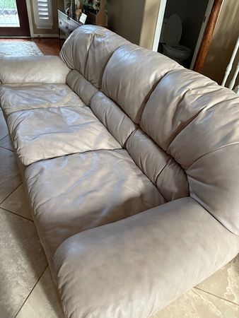 Three cushion mid height leather sofa, color is “Clay”, great condition.