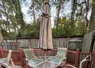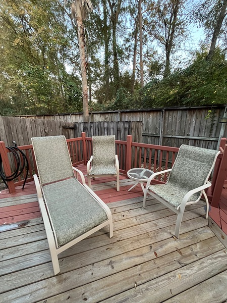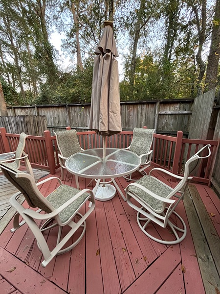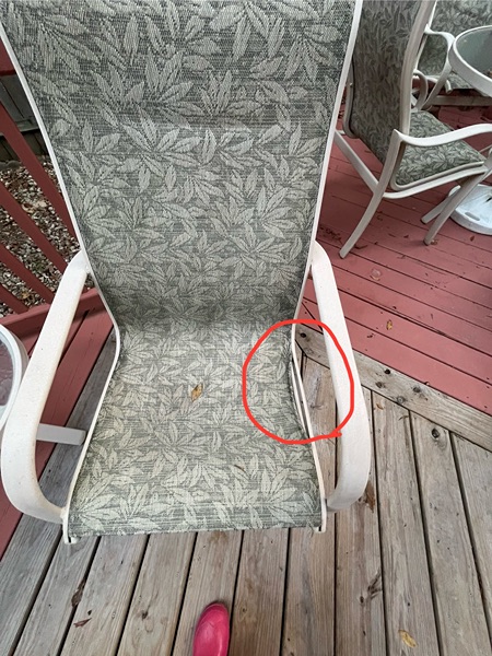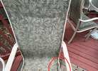 Bought from Chair King several years ago. Still in good and sturdy condition. It includes 3 swivel chairs, 4 chairs, 1 chaise, 1 table (big), 1 table (small) and umbrella. 1 chair has a small tear (see the picture)