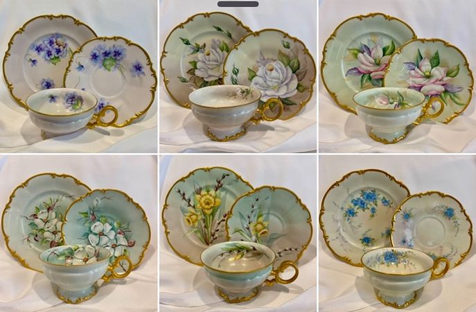 These sets are vintage and include a dessert plate, saucer and cup. The complete collection is made up of six (sets) with each set featuring a different flower. There are no chips or damage.