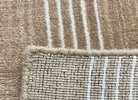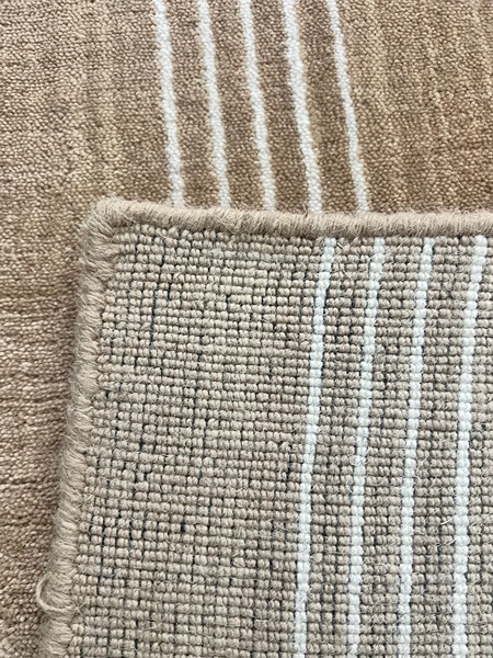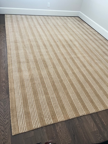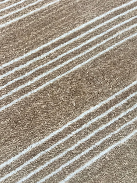 Gorgeous, soft 9x12 wool rug. It lays beautifully. It has a couple areas of wear but not noticeable. Pulls can be clipped. It is camel with ivory stripes.