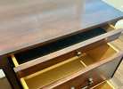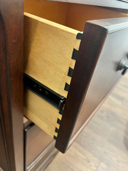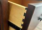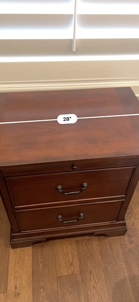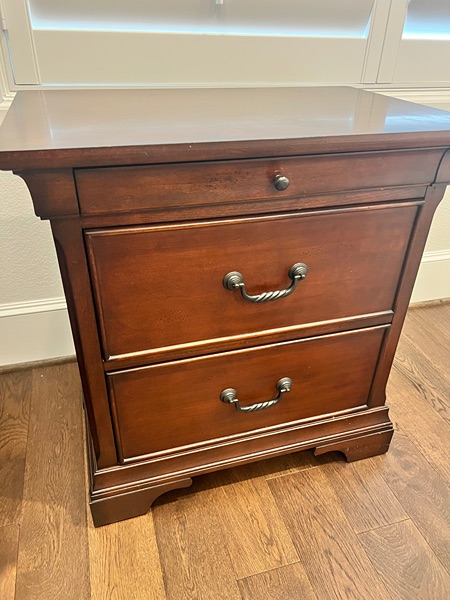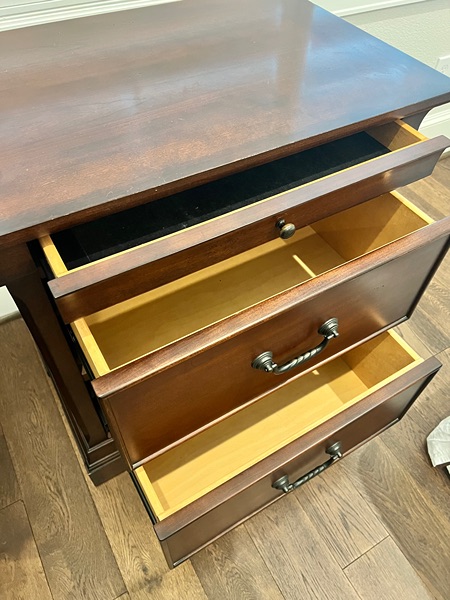 Wood nightstand with three dovetail drawers. Top drawer is lined with velvety liner. It has slight wear but sturdy and in great condition. Measurements in photo and are approximate.