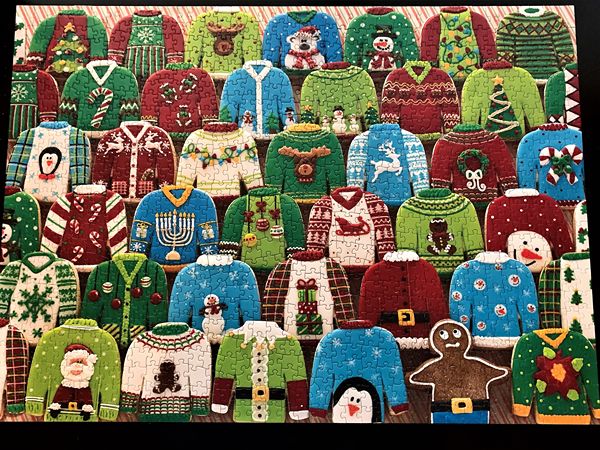 Display of 35+ colorful holiday sweaters depicting Santa, snowmen, reindeer, wreaths, ornaments, trees, poinsettia, etc. Finished size is 19¼” x 26½”. 1000 random cut pieces. Ages 12+. Preowned. Complete. Clean, pet & smoke free home. Excellent condition. Fun family Christmas activity.