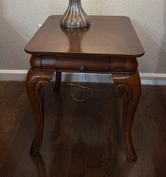 Rectangular end table with one drawer. Table is 26 inches long by 22 inches wide and 23 inches high.