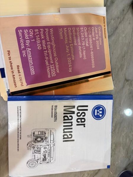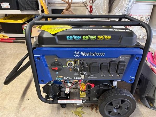 Westinghouse Portable generator WGen9500TFc, 12,500 Peak Watt Tri-Fuel, purchased June of 2024. Paid $1,149 and Never been used. Owners manual included.