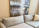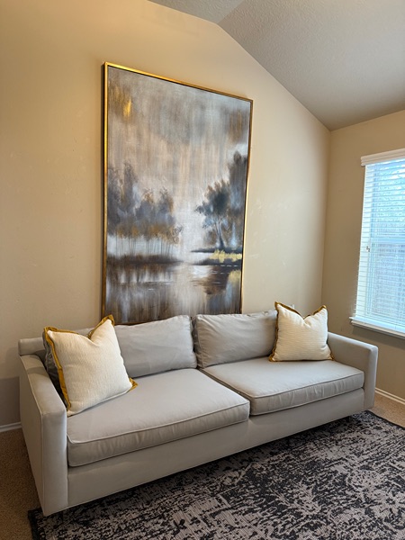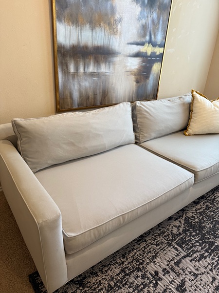 Beautiful Hunter Sofa from Mitchell Gold & Bob Williams. It’s in great condition. No rips or stains. We just shampooed the base & fully washed all covers. This model is 90” wide with polished stainless steel legs. It’s a Stunning Sofa!