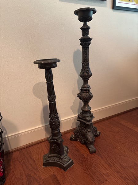 These are two lovely metal candleholders. They have a bronze finish. The shorter one measures Approximately 25inches. The larger holder measures approximately 36 inches. They are classically designed and in very good condition.