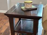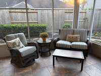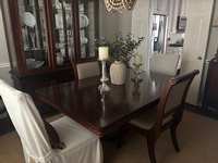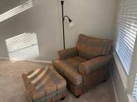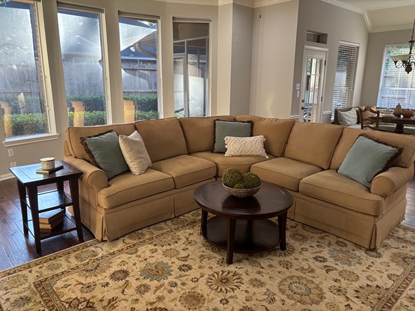 Bassett L-Shaped Couch Down-cushions includes throw pillows. Cushions and fabric in very good condition. Sellers are moving and cannot take with... $600 or best offer. Can negotiate rug, coffee and end tables. They are listed as well.