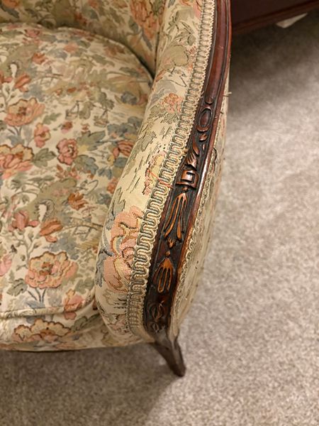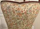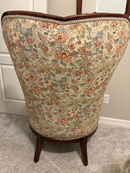 Tapestry-style floral upholstery (likely mid-20th-century fabric)