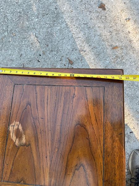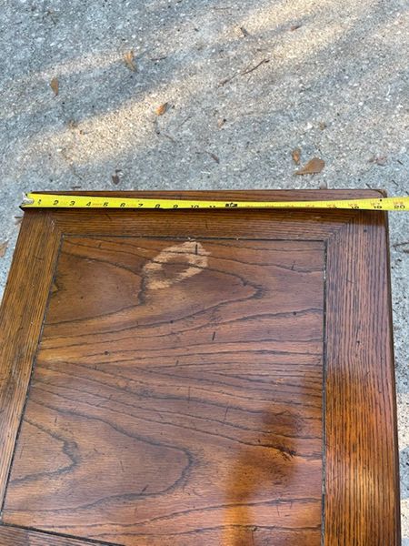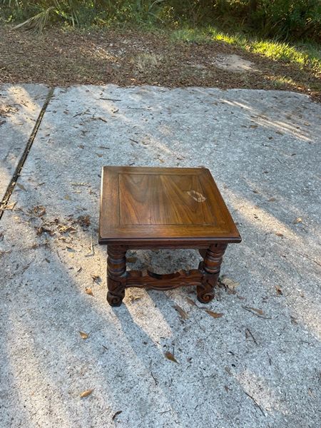 Approximately 19 X 19 inch table 16 inches tall. Needs soem refinish work but has strong decorative bones. Please text me at 713-578-0511 if interested.