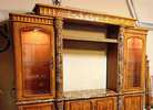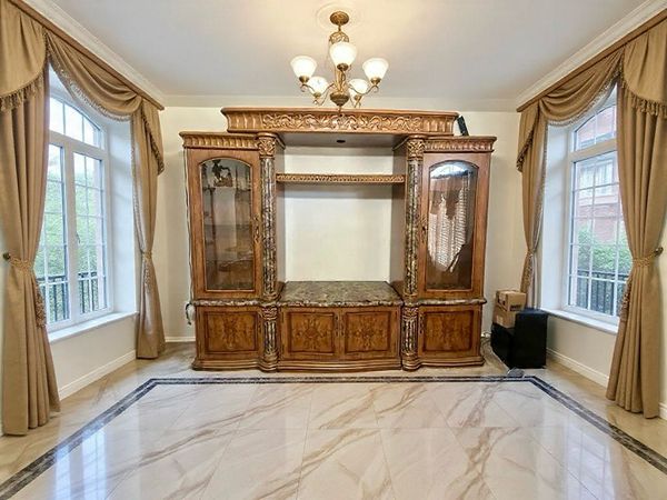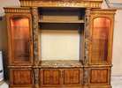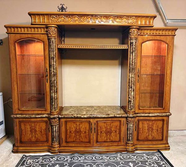 Stunning Elegant Wooden Entertainment Center, Beautifully hand carved with lateral glass curio cabinets. Approximate dimensions Height 87" Wide 105" (Expandable with the extensions included) Deep 24". The side cabinets are joined by a screwed shelf. Free of smoke or pet odor, Overall, it's a piece of furniture in excellent condition. RARE TO FIND.