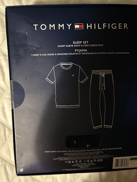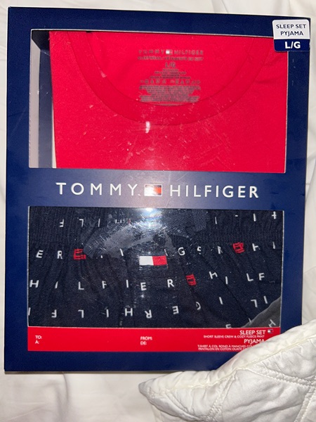 Tommy Hilfiger size large 2 pc pajamass. The top is a red knit t shirt and the bottoms are a comfy many print flannel. They are new and in a gift box. Great for Christmas gifr