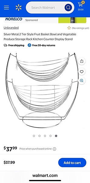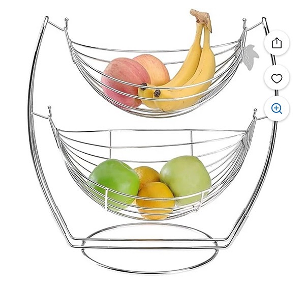 "Double design to artfully display your fresh produce. Chrome metal construction for durability and style. Provides unparalleled air circulation to your fruits and vegetables to keep them fresher longer"…$40, total, firm