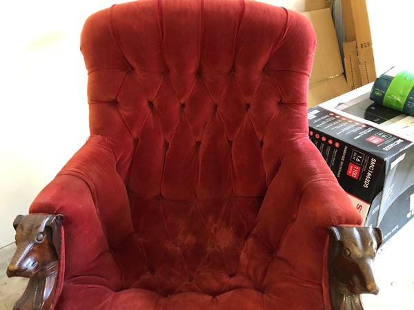 Antique Victorian style chair with carved dogs heads on the armrests. Wood is walnut. Circa 1870-1880. Probably from Denver. Asking $115.00.