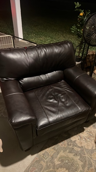 Thick, heavy, real-leather armchair in deep espresso brown. Super comfortable, wide arms, deep seat, and built like a tank. Perfect for a living room, office, reading corner, or a "this is my spot" chair.