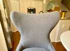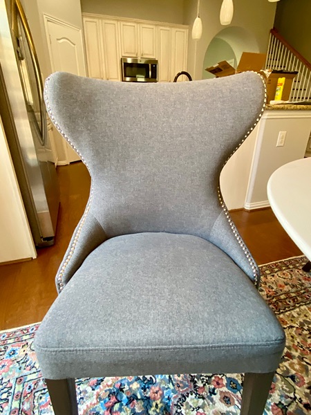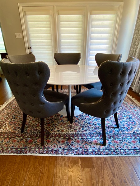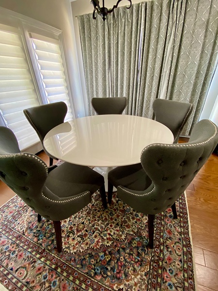 Moving, must sell. 54" round white lacquer table. 28.5" Height. Single pedestal base. Five Ariana dining chairs. Sunday graphite color fabric. Button tufted back, silver nailhead trim, espresso wood legs. 25"W x 24"D x 37.5"H. No rips or tears or stains. One small nick on chair leg from prior move. Sold as is. Smoke free and pet free home. Must have your own movers and truck. Pickup in Spring. No holds.
