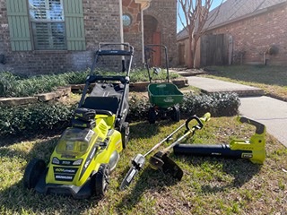 Ryobi lawn mower, edger, blower, tree cutter and Scott's fertilizer. Pickup in Spring (99 at Rayford Rd). Everything works. Batterieis like new. Please provide a phone number for a call back when inquiring.