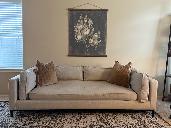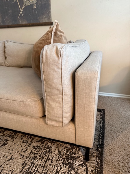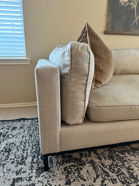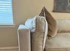 Just been steam cleaned & fully washed all covers. No rips or stains. Couch is sturdy & very well kept. Bench seat & feather blended cushions.