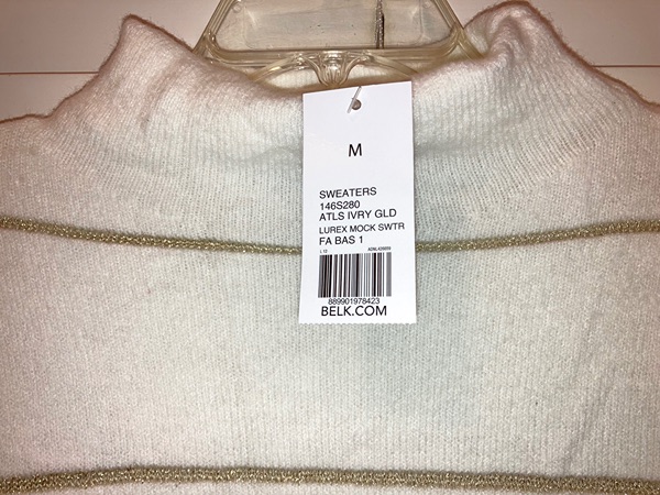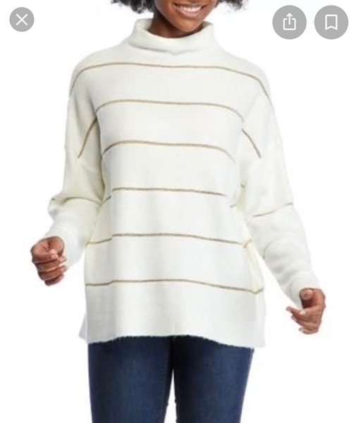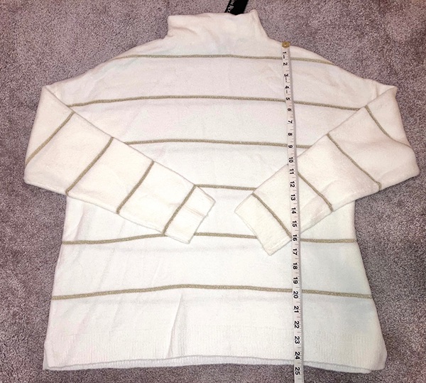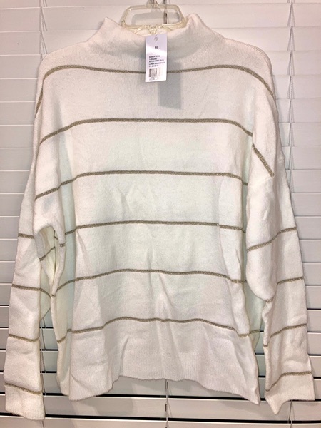 Brand is Kim Rogers, size is medium. Lurex stripes add a glimmer affect. Mock neck pullover. Machine washable. $54 originally. New with tags from smoke free home. $15