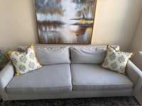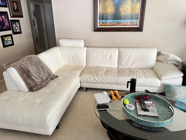 Ivory leather sectional for sale. Some wear on seats, but otherwise in good condition. Originally bought from Danish Inspirations. Dimensions: 114" wide, chaise length 88"