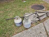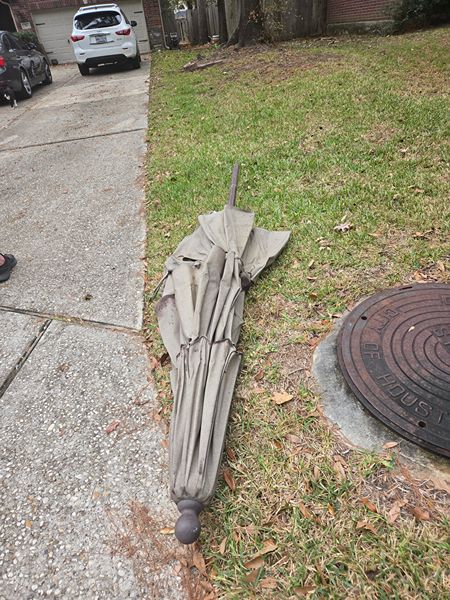 Extra large outdoor umbrella. Works but could probably be cleaned up a bit. On corner 18 Indian Corn Pl 77384