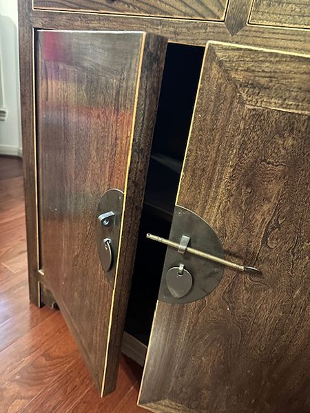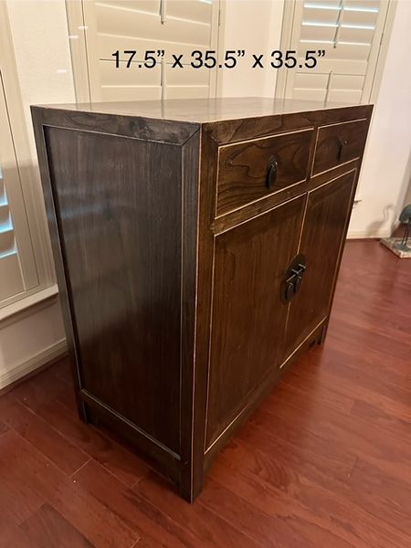Gorgeous wood cabinet in excellent condition. Made of 100% hardwood with Chinese-style hardware. Purchased during an expat assignment to Shanghai. 17.5"W x 35.5"L x 35.5" H