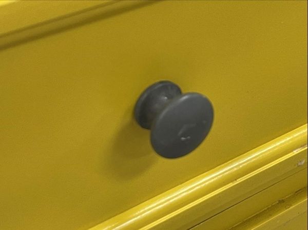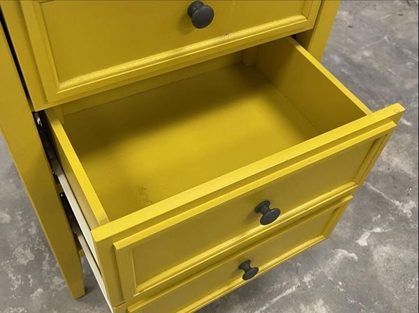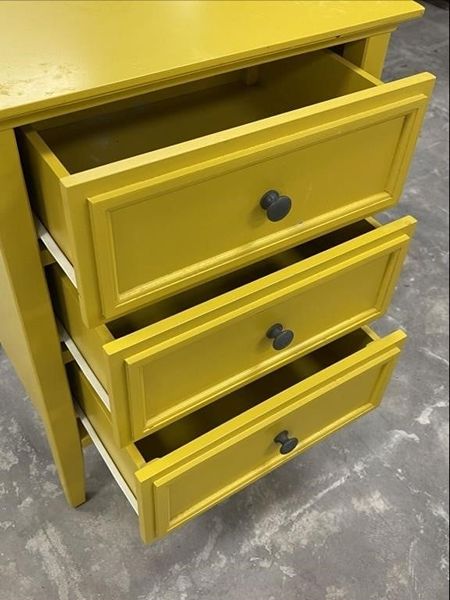 Yellow Wood Contemporary 3 Drawer good quality accent table with very quality drawers. Very easy to wipe clean. Has a few little imperfections that are barely noticeable, one small spot with very little paint missing see photos, Overal is in good solid condition, still very attractive in appearance. Adds a pop of color to any room needing added storage. The yellow color is slightly darker than appears in photos. The color is Bohemian Yellow 24'H x 18'W x 15'D Table is slightly darker than photos. Pickup location, near downtown Conroe