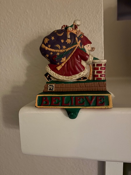 A Santa stocking holder with the word, BELIEVE on the bottom banner.
