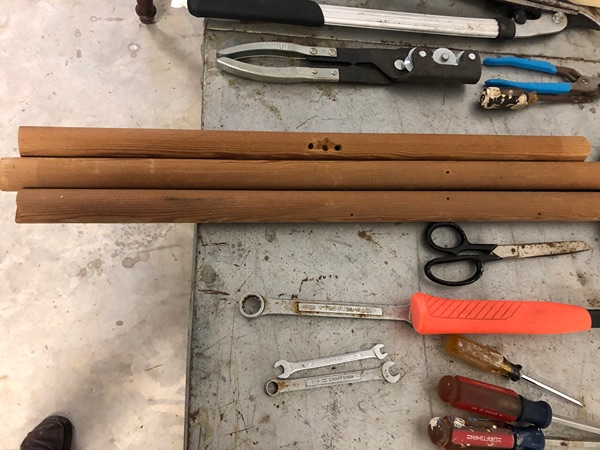3 dowel rods about 2 feet long and 3 pieces of wood 3 feet long. Free.