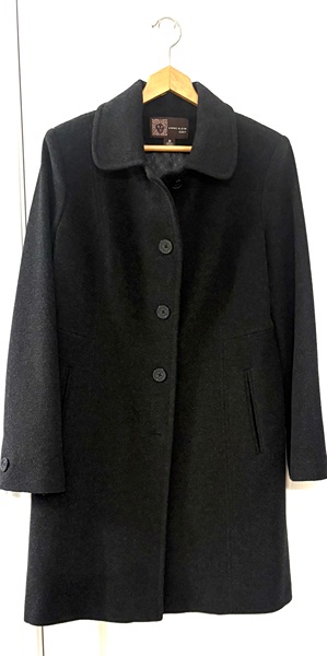Grey Anne Klein coat excellent condition. Worn once-was too small. Size 12 ladies regular, wool and cashmere blend, lined, about knee lenght. Is more mid grey color rather than the dark grey that appears in the picture. I can email more pictures if needed.