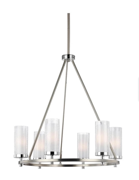 one-tiered, 6-light chandelier is particularly dramatic and will be the highlight of any space
