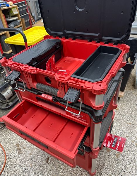 Selling new Milwaukee packout system. I ended up not using this. Includes Rolling Toolbox with low profile handle, Medium toolbox, and 3 Drawer tool box. Paid $450, asking $350.