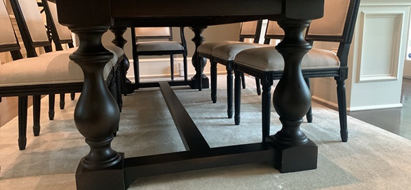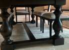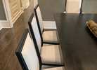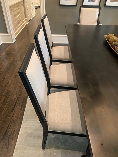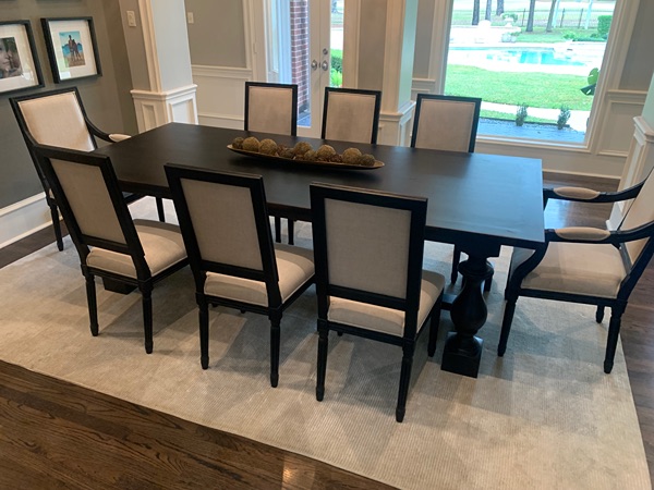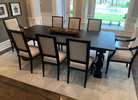 Restoration Hardware 17th C dining room table. Black walnut 96"L x 44"W x 30"H. Prestige shape. 6 French square back upholstered cream chairs and two captains chairs. Rug included. Retails over $9000 will sell for $3500.