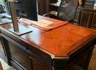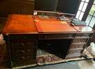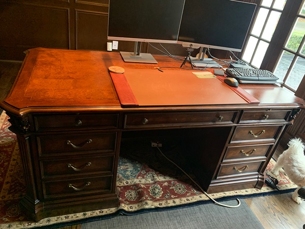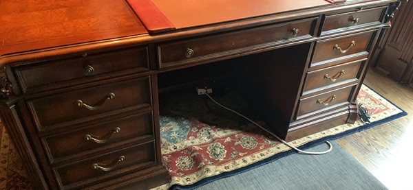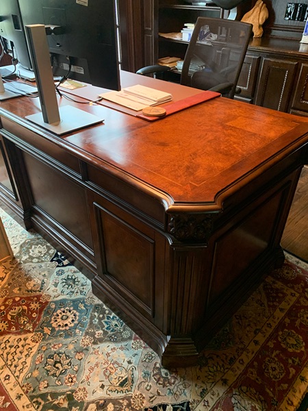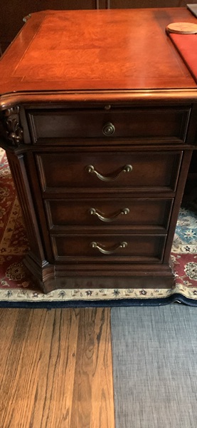 Solid/sturdy dark reddish oak office desk. Rug and chair included. Lots of storage. 72"L x 36"W x 31"H.