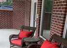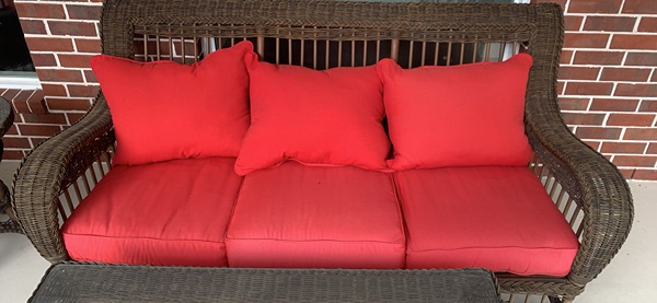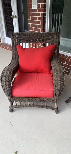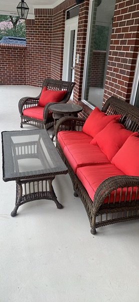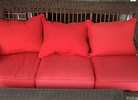 Solid heavy wicker outdoor furniture. Red cushions included. Couch, chair, glass top table and side table