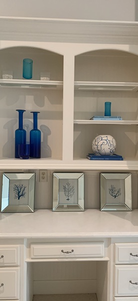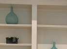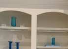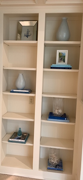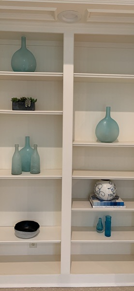 Blue and white hardcover books, vases and bowls. Perfectly accent a bookshelf.