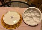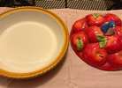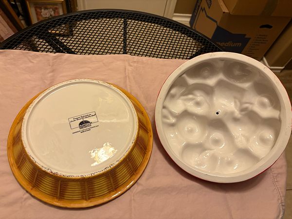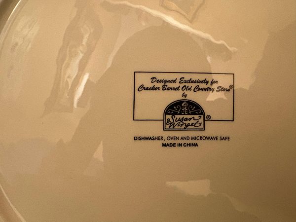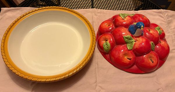 It's a two-piece ceramic set featuring a round dish and a lid designed to resemble apples with a blue bird perched on top. It's oven-safe, microwaveable, and dishwasher safe.  The dish measures 10 1/2 inches in diameter and 2 inches in depth.  This specific design is a Cracker Barrel exclusive by Susan Winget. Compare price.