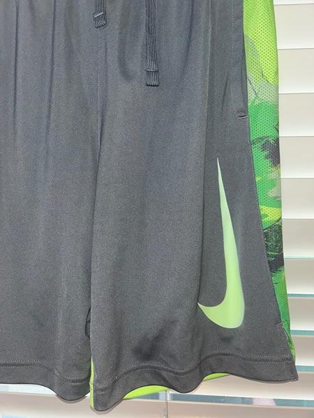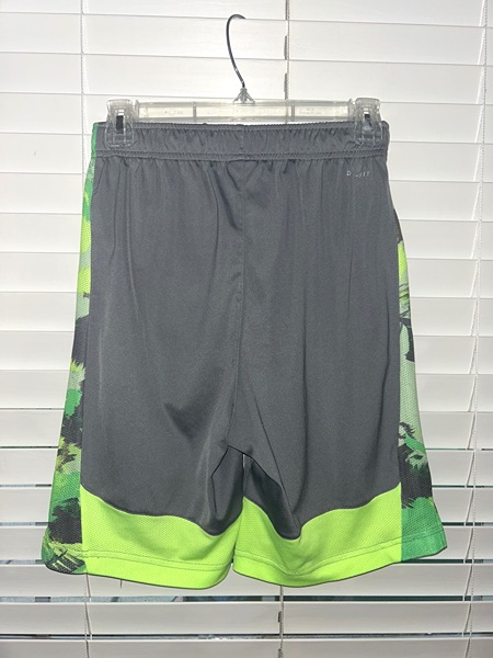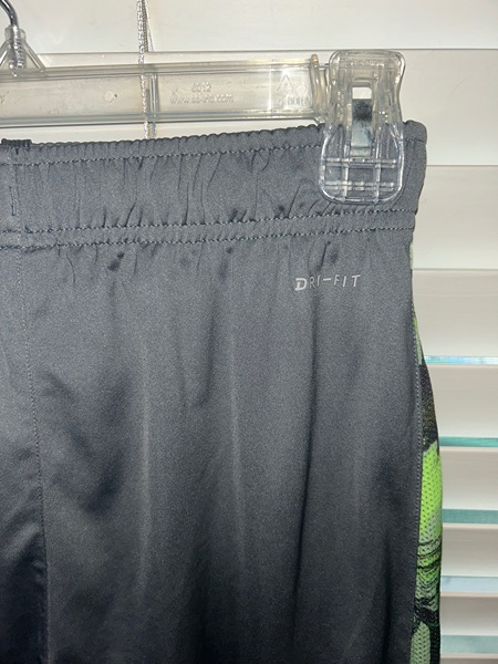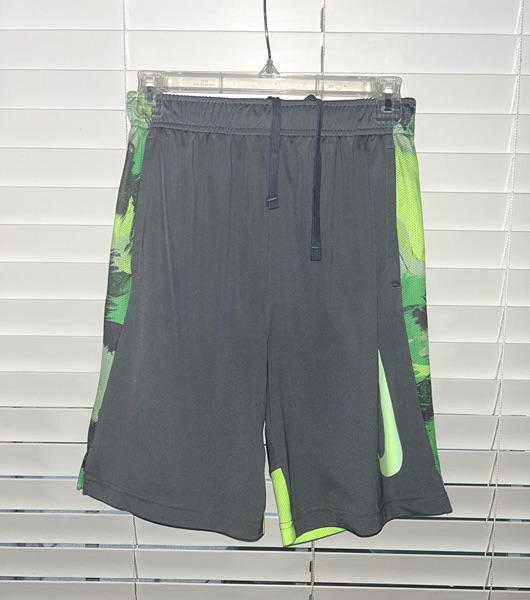 Boys large Nike Dri-Fit Shorts. Features large green logo in front, mesh green trim, split hems, pockets, 8.5 inch inseam, and elastic drawstring waist. Very good condition from smoke free home. $8