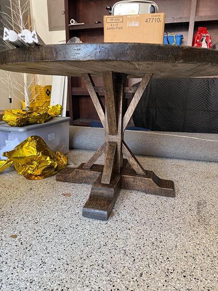 Beautiful solid wood round dining table. With a sturdy pedestal base. This piece has a rich, dark stain that highlights the natural grain of wood, giving it a warm, rustic farmhouse feel. The table is extremely well built and heavy, with a wide stable base that keeps it steady. Perfect for a kitchen, breakfast nook, dining room, or even as an entry table. Seats 4-6 people comfortably. It is a 60inch round table. Condition - gently used, pick up only.