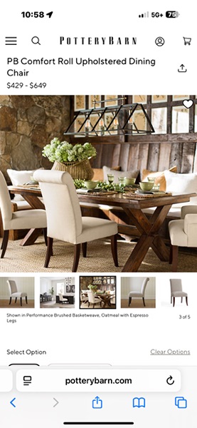 6 Pottery Barn Chairs - I spent $350 a piece. They are in great shape, very comfortable. See more https://www.potterybarn.com/products/pb-comfort-roll-side-upholstered-dining-chairs/?_cn_psugg_q=comfort%20chair
