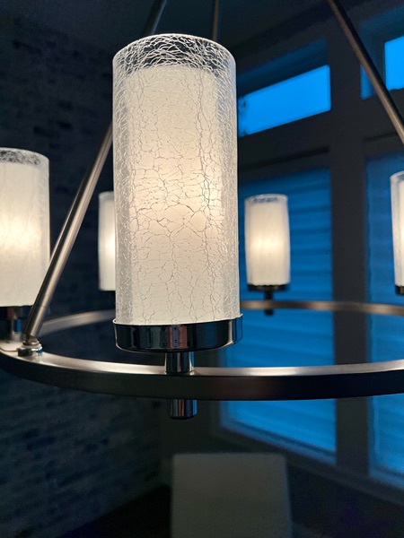 cylindrical, crackled glass shades with white inner glass to create soft light