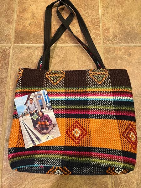 A beautifully hand woven bag from Thimphu, Bhutan (pictured). Zippered top with internal zippered pouch. Measures 13x16 inches.