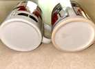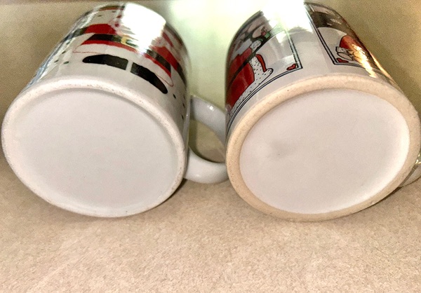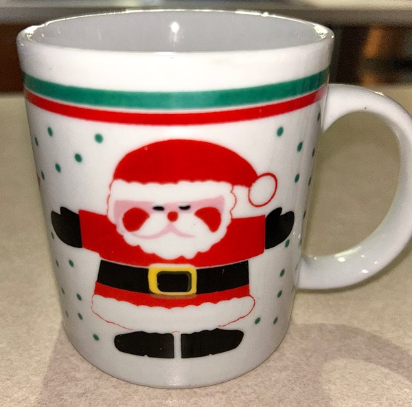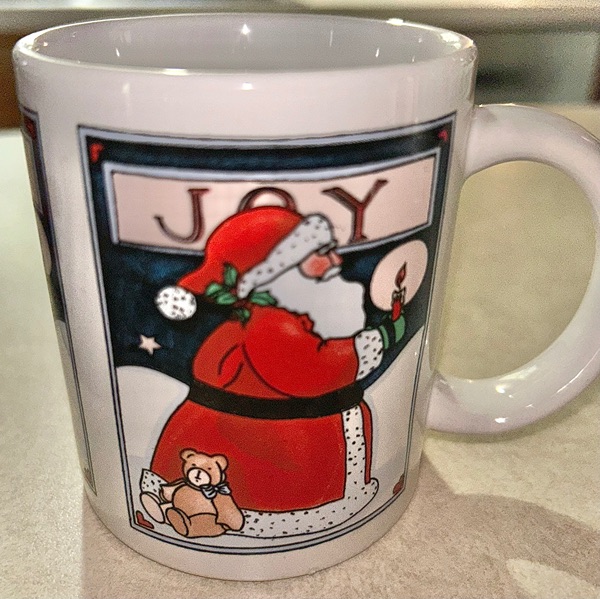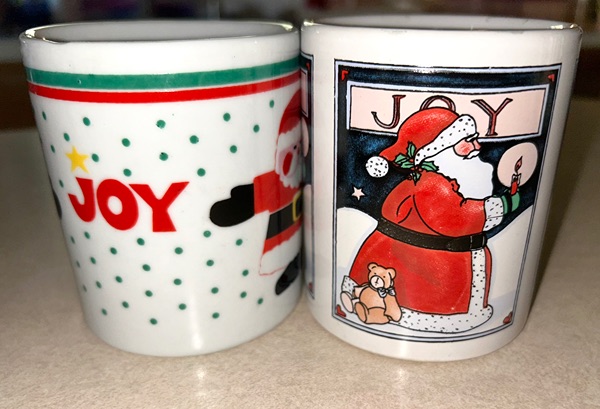 "Joy" themed Christmas mugs, each featuring a Santa and the word joy. Likely vintage, as these are from my mom's lifelong holiday mug collection. $3/each or both/$5. Smoke free home.