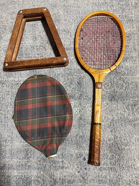 Vintage Speedwood tennis raquet with plaid cover and wooden protector. Custom crafted, made in USA