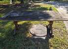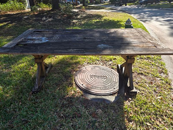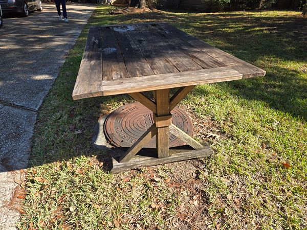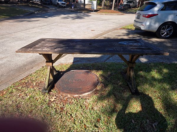 Pier One outdoor table needs a little love but has some life left in it. We were going to get a plastic picnic tablecloth for it or replace a couple of the top pieces of wood. It's yours if you want to come get it! *Still available as of 12/7 at 1:00 p.m.