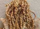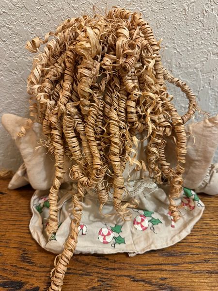Cute dolls with raffia hair ** dresses have Christmas designs on them ** Large one is approx. 24" ** Small one is approx. 15"